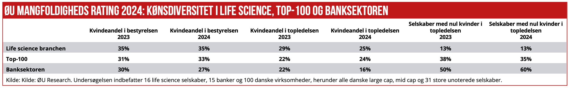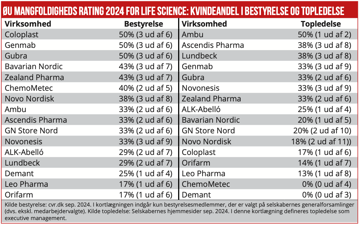 ØU Mangfoldigheds Rating 2024 for Life Science: Selskaberne inden for life science har samlet set flere kvinder i både topledelsen og bestyrelsen end det øvrige danske erhvervsliv. Hos Genmab og Gubra er der lige mange mænd og kvinder i bestyrelsen samt 33% kvinder i topledergruppen. LEO Pharma og Orifarm halter bagefter. I snit er 25% af toplederne i life science sektoren kvinder, hvilket er en tilbagegang i forhold til sidste år, her var det 29% – skriver redaktør Claus Strue Frederiksen