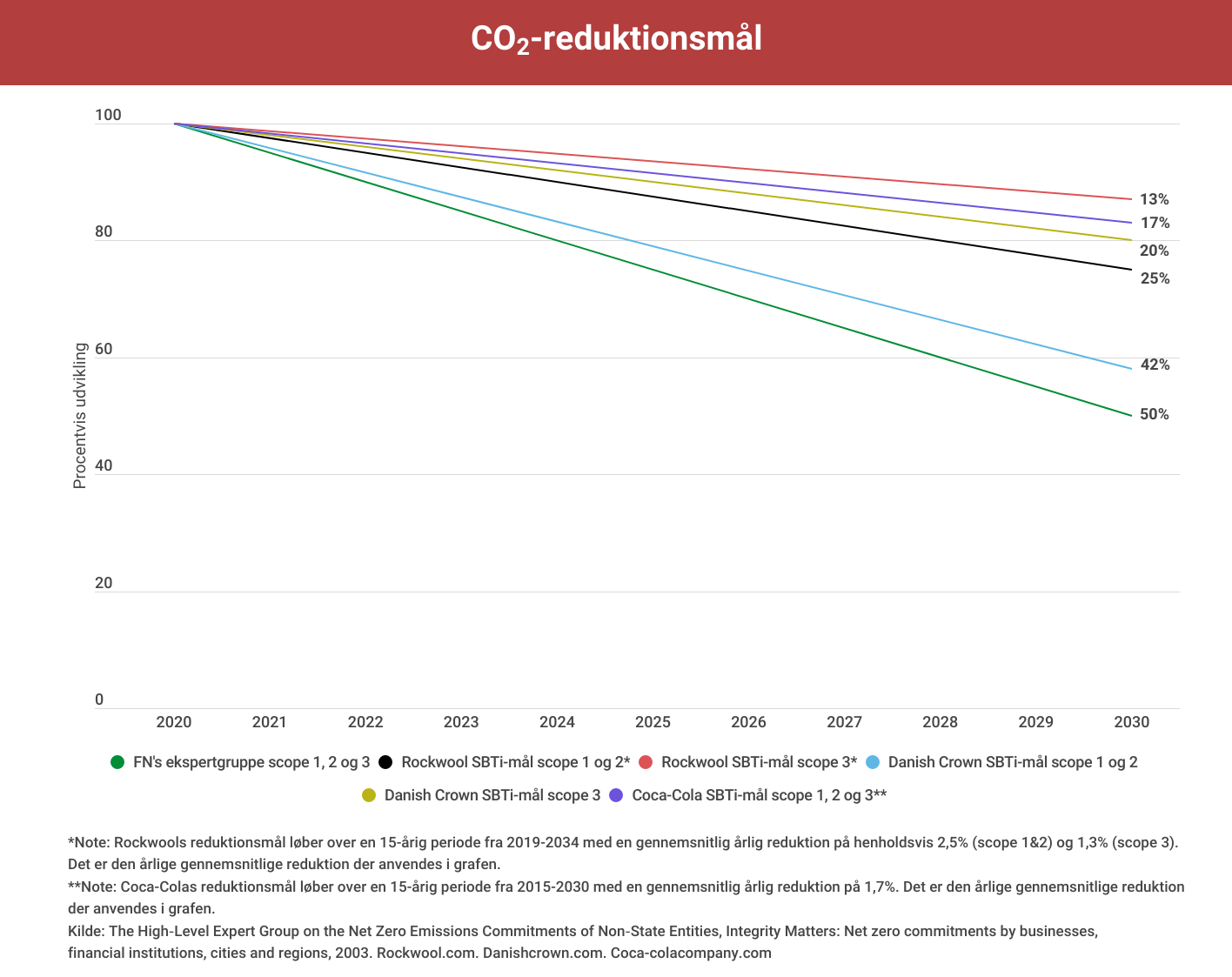 Rockwool har en målsætning om at reducere CO2-aftrykket fra egne fabrikker med 2,5% om året frem mod 2034. Danish Crown har forpligtet sig til at reducere CO2-aftrykket fra leverandørkæden, der udgør over 95% af kødgigantens klimaregnskab, med 2% om året. Begge selskabers mål er godkendt af Science Based Targets initiative (SBTi), der også har godkendt et samlet CO2-reduktionsmål for Coca-Cola på 1,7% om året. Selvom disse klimamål ligger langt under anbefalingerne fra en FN-ekspertgruppe, fastholder både Rockwool og Danish Crown overfor Økonomisk Ugebrev, at der er tale om ambitiøse målsætninger.