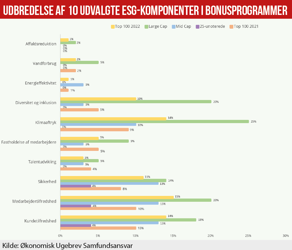 I Økonomisk Ugebrevs undersøgelse er det blot 12 procent af de store danske unoterede selskaber, der har integreret ESG-komponenter i topledelsens variable aflønning. Derved halter de store danske unoterede selskaber umiddelbart langt bagefter de børsnoterede large cap og mid cap-selskaber – for large cap er det 59 procent af virksomhederne, der har integreret ESG-komponenter i topledelsens bonusprogram, for mid cap er det 39 procent.