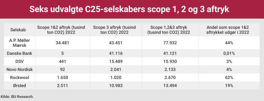 Tabellen viser, at der er stor forskel på, hvor meget scope 1 og 2 aftrykket udgør af det samlede scope 1, 2 og 3 aftryk for seks udvalgte C25-selskabers. Eksempelvis udgør scope 1 og 2 aftrykket 0,01 procent af Danske Banks samlede CO2-aftryk, hvorimod scope 1 og 2 aftrykket udgør 62 procent af Rockwools samlede CO2-aftryk. For DSV og Mærsk udgør andelen af scope 1 og 2 aftrykket henholdsvis 3 og 44 procent af selskabernes samlede CO2-aftryk.**