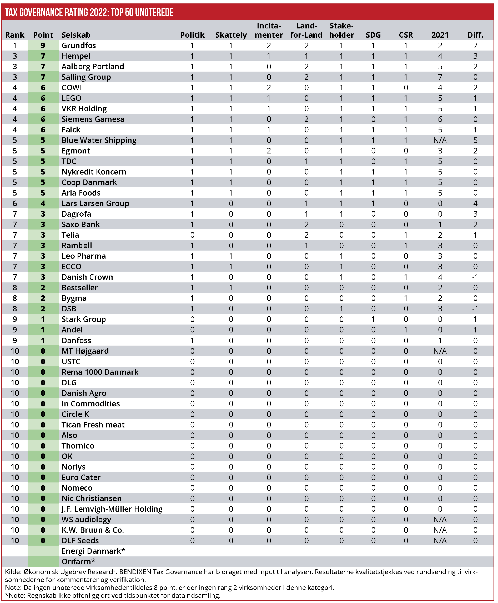*Da Energi Danmark og Orifarm ikke havde udgivet relevante regnskaber ved udgivelsestidspunktet, indgår der i år 48 virksomheder i Økonomisk Ugebrevs Tax Governance Rating top 50 unoterede virksomheder.