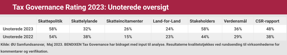 De store unoterede selskaber klarer sig generelt bedre i år end sidste år. Eksempelvis var det blot 15 procent af de unoterede selskaber, der sidste år oplyste om skatteincitamenter, mod 26 procent i år. Og hvor det sidste år var 38 procent, der inkluderede deres arbejde med ansvarlig skat i deres årlige bæredygtighedsrapportering, er det i år knap hver anden.*