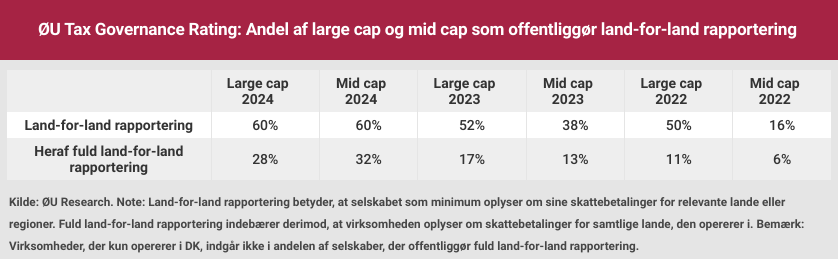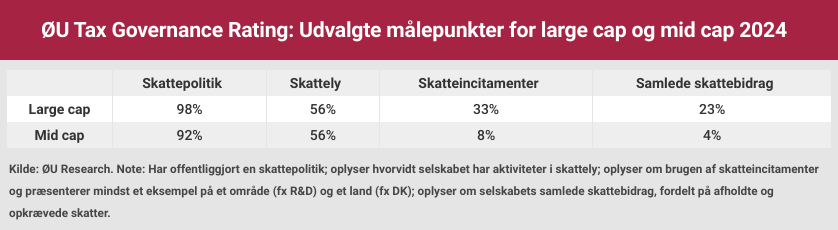 Økonomisk Ugebrevs Tax Governance Rating 2024 viser, at de største selskaber i large cap fortsat er bedre til skattetransparens end de mellemstore mid cap-selskaber. Afstanden snævrer dog ind og i visse målepunkter ligger de to grupper på linje, eksempelvis i land-for-land rapportering. Ifølge Christian Hallum, skatteekspert i Oxfam, viser Økonomisk Ugebrevs undersøgelse af de store og mellemstore børsnoterede selskaber, at ansvarlig skat er gået fra være niche til at være mainstream.