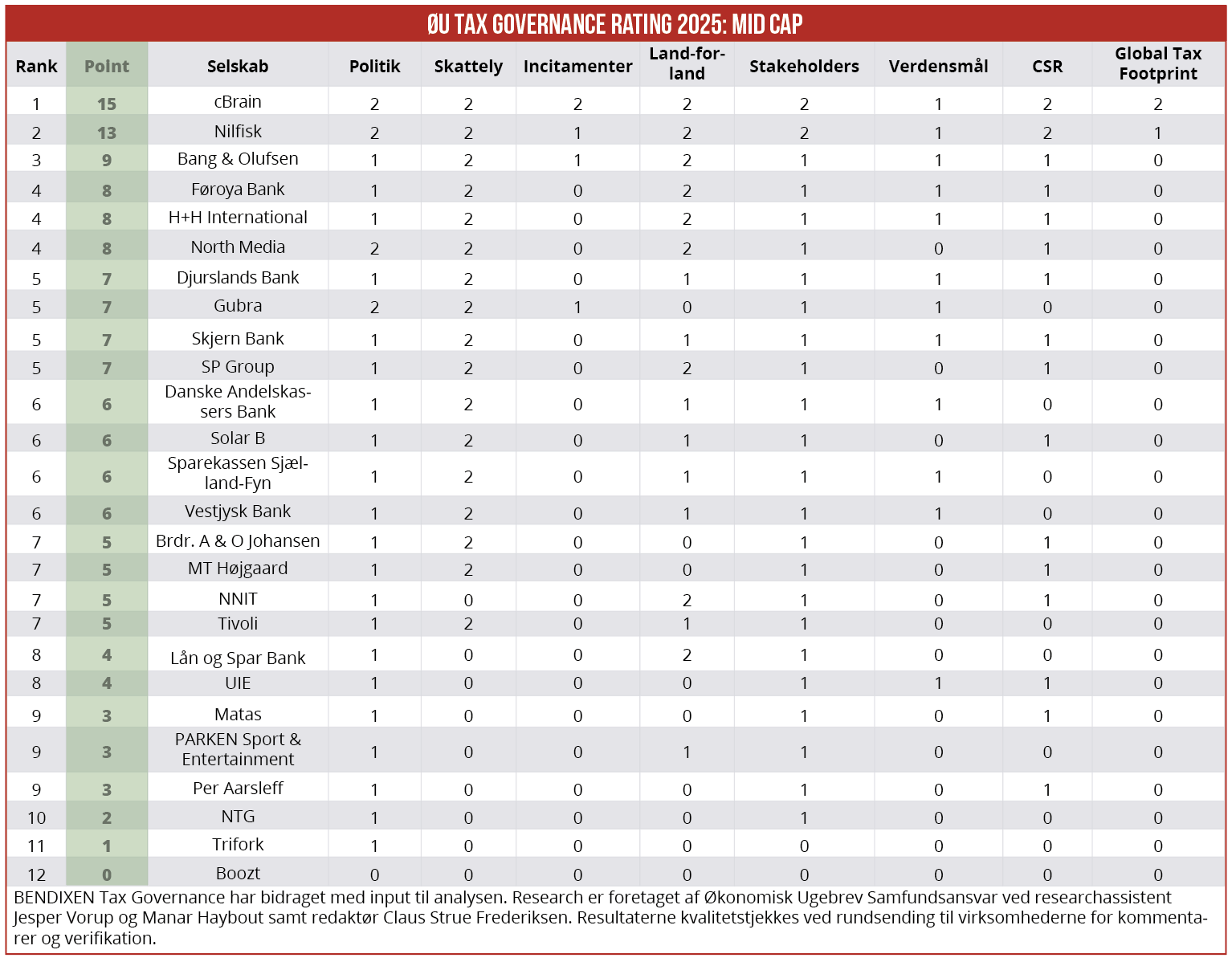 Med 15 point ud af 15 mulige vinder cBrain dette års udgave af Økonomisk Ugebrevs Tax Governance Rating for danske mid cap-selskaber. Nilfisk indtager 2. pladsen med 13 point, mens Boozt ender som nummer sjok, med nul point. Generelt er der fremgang at spore i de mellemstore børsnoterede selskabers skattetransparens. Redaktør Claus Strue Frederiksen gennemgår her årets resultater. Økonomisk Ugebrevs Tax Governance Rating omfatter samlet 120 børsnoterede og unoterede selskaber.
