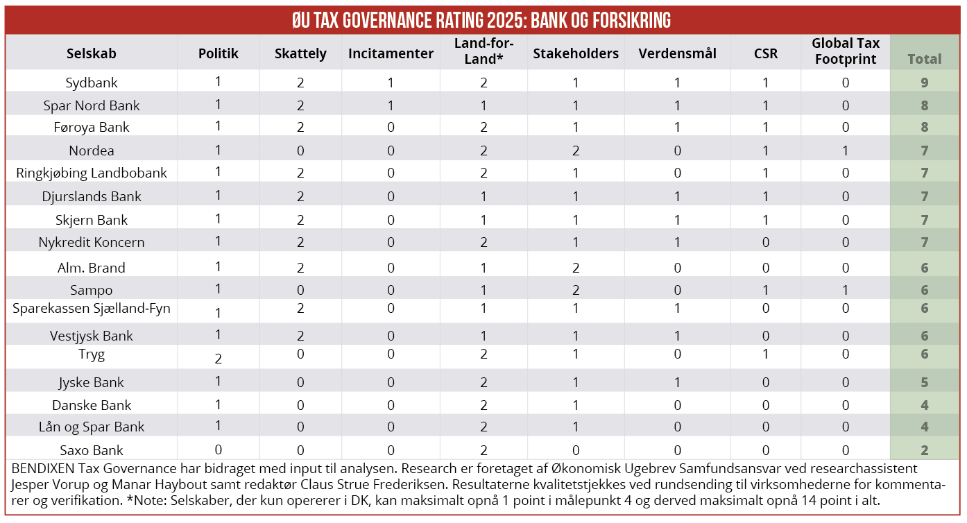 Med 9 point ud af 15 mulige topper Sydbank Økonomisk Ugebrevs Tax Governance Rating for finanssektoren 2025.