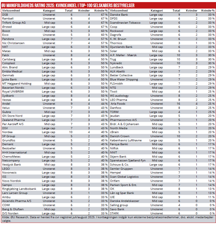 Økonomisk Ugebrevs kortlægning af 100 danske selskabers bestyrelser viser, at otte af selskaberne har flere kvinder end mænd i bestyrelsen. Det drejer sig blandt andet om DSB, Rambøll og Ørsted, der alle har en bestyrelse med seks eksterne bestyrelsesmedlemmer, heraf fire kvinder.