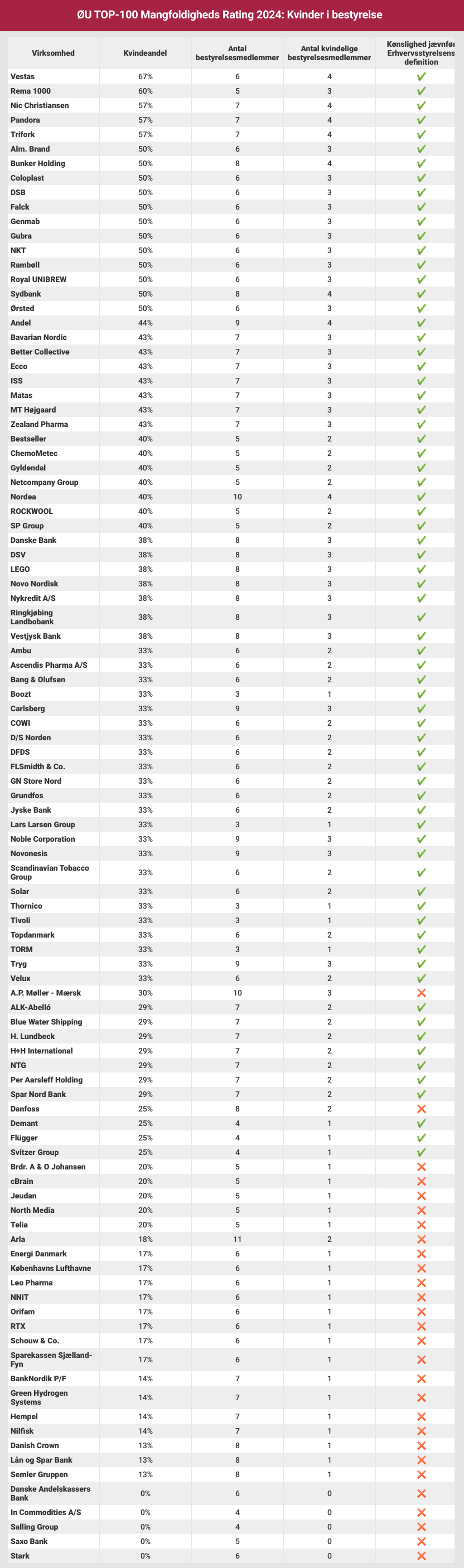 Økonomisk Ugebrevs kortlægning af 100 danske selskabers bestyrelser viser, at blot fem selskaber har flere kvinder end mænd i bestyrelsen. Det drejer sig om: Nic Christiansen, Pandora, Rema 1000, Trifork og Vestas. Derudover har tolv selskaber lige mange mænd og kvinder i bestyrelsen, mens 83 af de 100 bestyrelser er domineret af mænd.