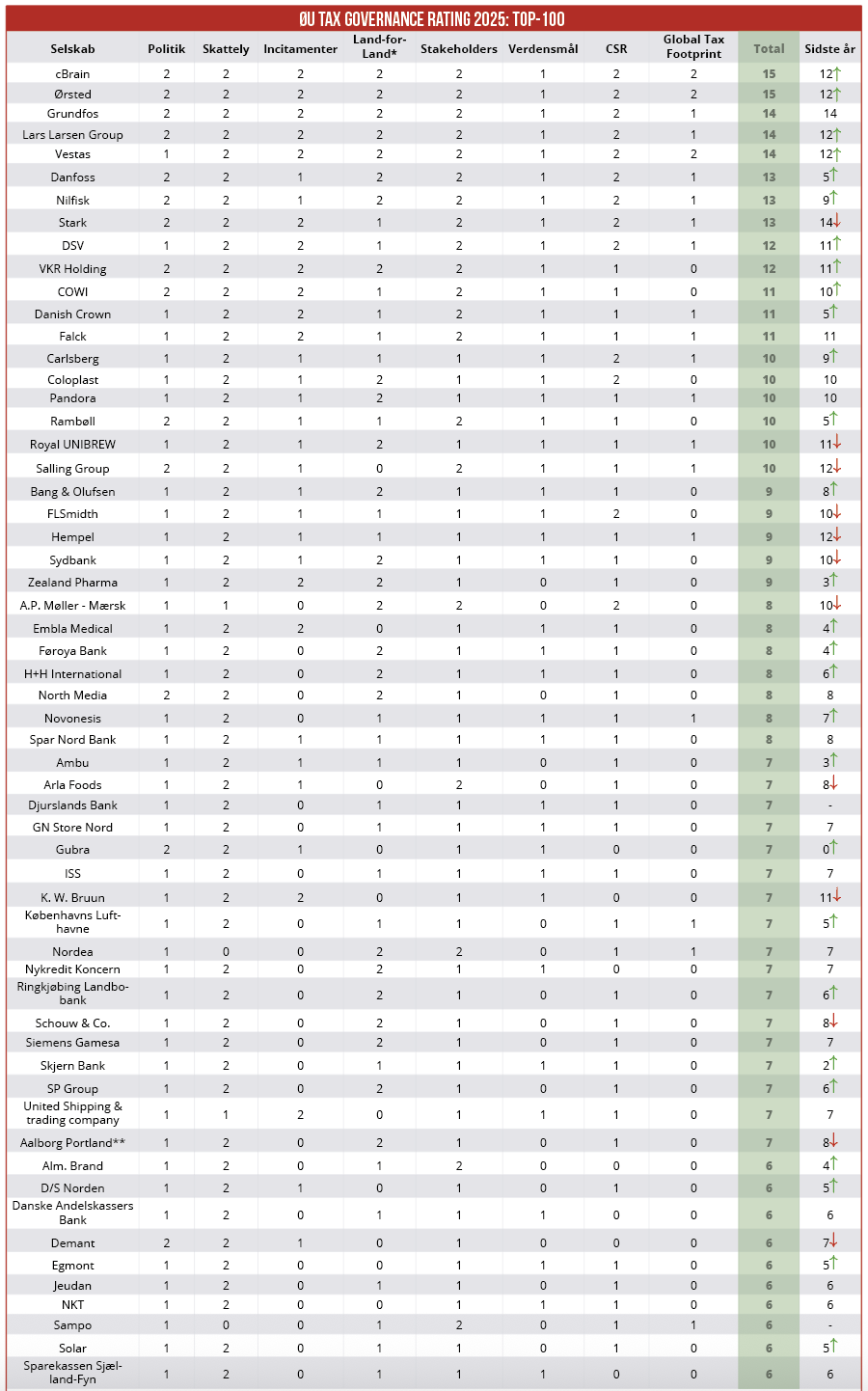 Med 15 point ud af 15 mulige indtager cBrain og Ørsted førstepladsen i dette års udgave af Økonomisk Ugebrevs Top-100 Tax Governance Rating. Med 13 point er Danfoss årets højdespringer – sidste år fik den danske industrikoncern kun 5 point. I bunden af listen ligger 13 selskaber med nul point. Redaktør Claus Strue Frederiksen præsenterer her den samlede rangliste over Top-100 Tax Governance Rating 2025, der tæller alle danske large cap, mid cap og 50 store unoterede, sammenlagt 118 selskaber.