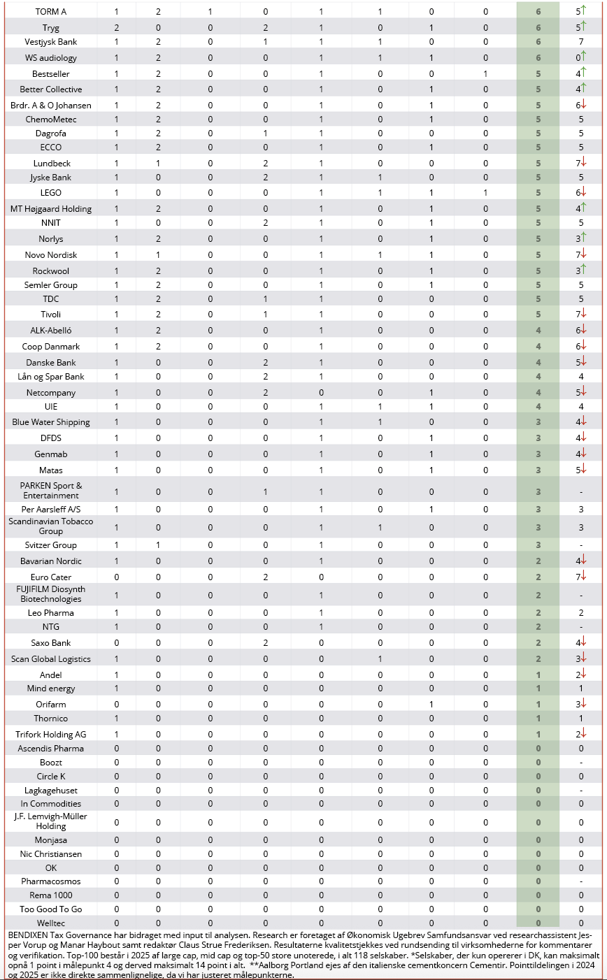 BENDIXEN Tax Governance har bidraget med input til analysen. Research er foretaget af Økonomisk Ugebrev Samfundsansvar ved researchassistent Jesper Vorup og Manar Haybout samt redaktør Claus Strue Frederiksen.
