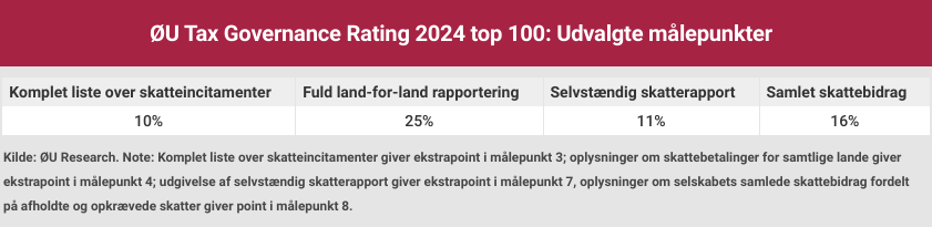 Hensigten med Økonomisk Ugebrevs Tax Governance Rating er at give indblik i danske virksomheders tax governance rapportering set i forhold til 8 udvalgte målepunkter. Undersøgelsen siger således udelukkende noget om, hvordan store (og mellemstore) danske virksomheder rapporterer på området – altså, en transparency rating.