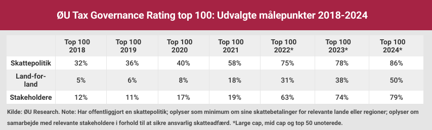 Eksempelvis havde knap hver tredje danske top-100 selskab offentliggjort en skattepolitik i 2018, i dag er andelen steget til 86 procent, svarende til en stigning på 169 procent. Desuden er andelen af selskaber, der oplyser om deres samarbejde med relevante myndigheder eller andre stakeholdere omkring ansvarlig skat seksdoblet, fra 12 procent i 2018 til 79 procent i dag.