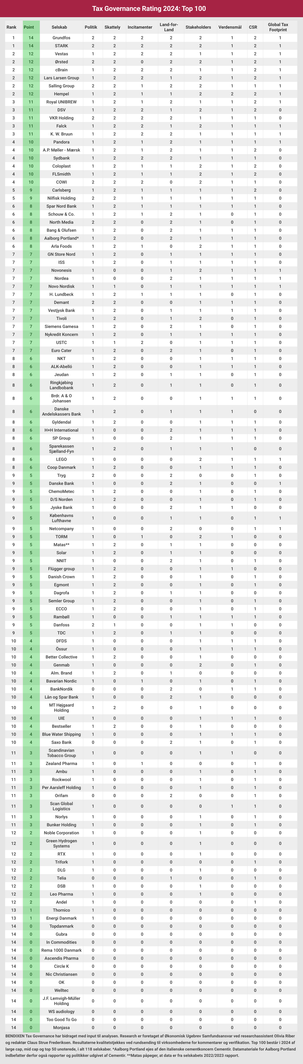 BENDIXEN Tax Governance har bidraget med input til analysen. Research er foretaget af Økonomisk Ugebrev Samfundsansvar ved researchassistent Olivia Riber og redaktør Claus Strue Frederiksen.