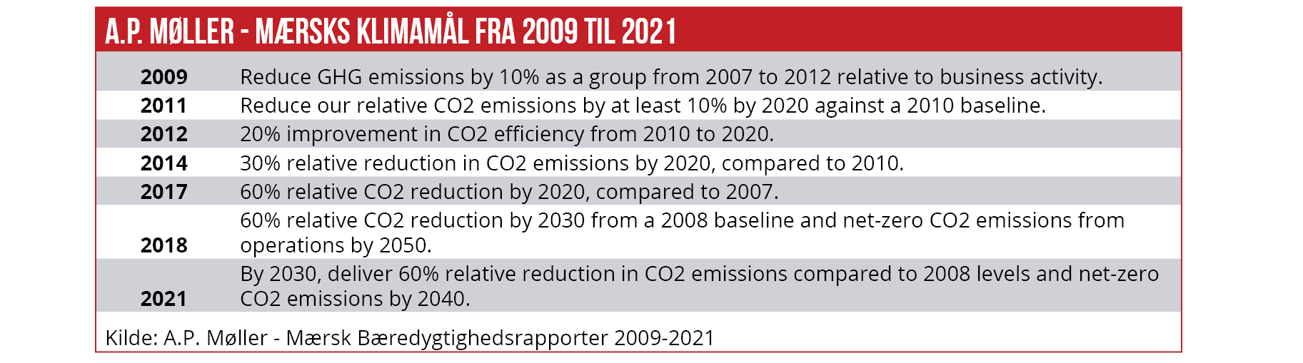 I 2009 præsenterer A.P. Møller-Mærsk sit første klimamål: at reducere selskabets udledning af drivhusgas (GHG) med 10 procent fra 2007 til 2012. Reduktionsmålet er relativt til virksomhedsdriften, hvilket forklares med, at A.P. Møller-Mærsk ønsker at øge sine forretningsaktiviteter. Målet er siden blevet korrigeret seks gange.