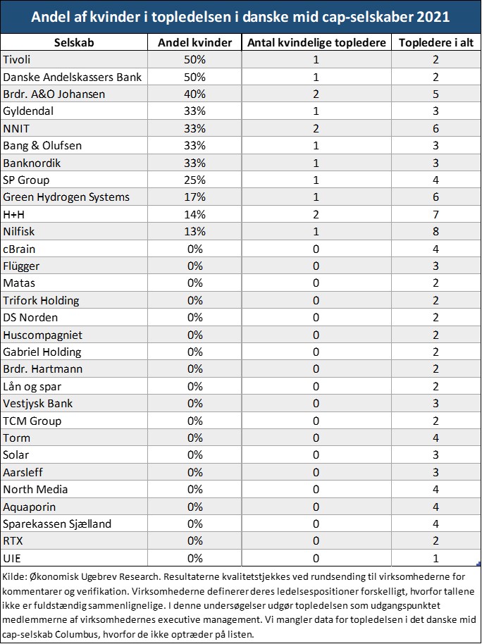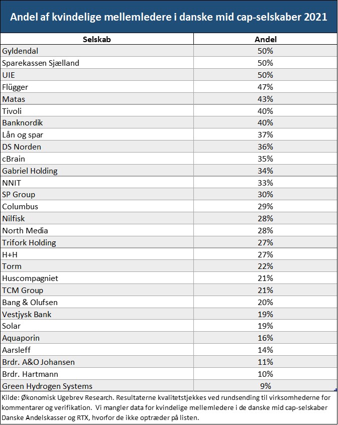 Syv mid cap-selskaber, nemlig Gyldendal, Sparekassen Sjælland, UIE, Flügger, Matas, Tivoli og Banknordik, har mellem 40 og 50 procent kvindelige mellemledere.